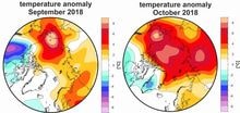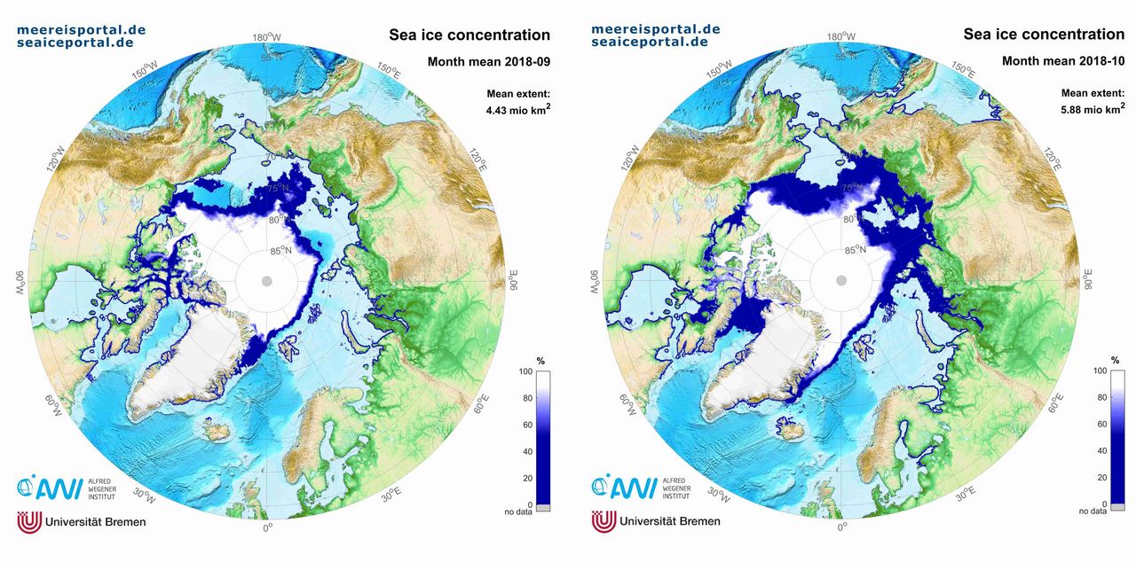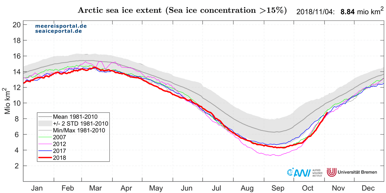 In October, the sea-ice extent in the Arctic was once again below the double standard deviation from the long-term average (see Figure 1).