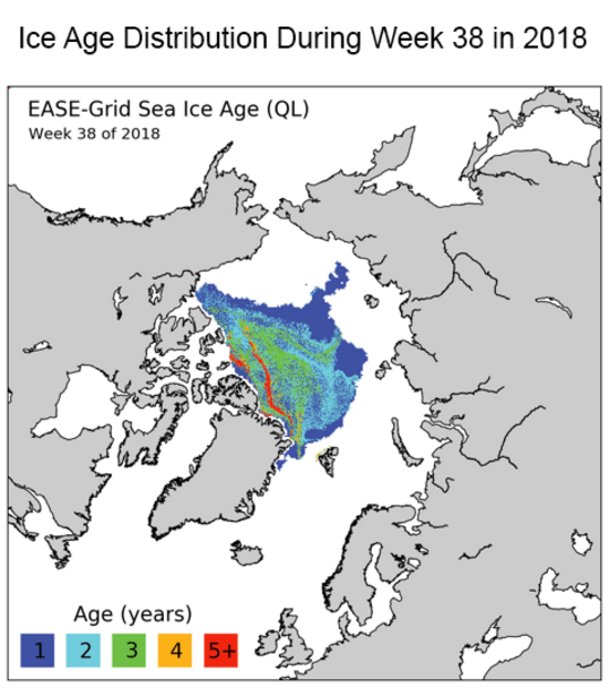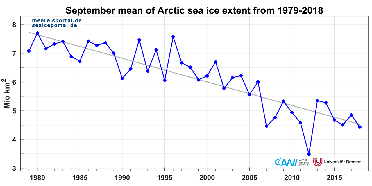In brief, the amount of late-summer multiyear ice has declined substantially since the 1980s and 1990s. Today the Arctic Ocean is covered by a maximum of 2 million square kilometres of multiyear ice. The ‘oldest’ sea ice, i.e., ice that had already survived for at least four melting periods, used to cover roughly 1.5 million square kilometres (see Figure 8b). According to NSIDC data, during the minimum in September 2018 the extent of old ice was a mere 0.94 million square kilometres (Source: NSIDC).