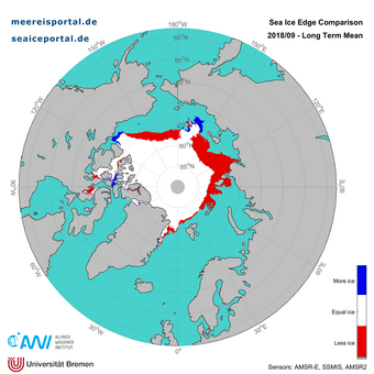 In the first half of September, large quantities of sea ice melted away; major ice loss was observed in the East Siberian Sea, as well as the northern regions of the Laptev Sea and Chukchi Sea (see Figure 4). For a detailed description of the causes, please consult the news entry from 13 September.