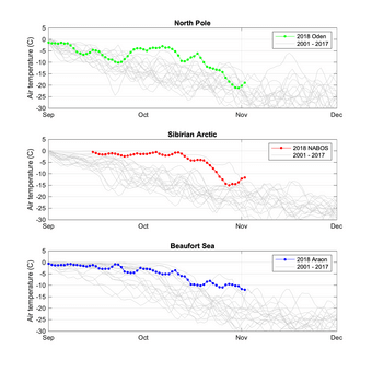 Currently, sixteen of our snow buoys transmit atmospheric-temperature data on an hourly basis to international weather forecasting systems (via the Global Telecommunication System, GTS); this data is also available on meereisportal.de. The AWI deployed the buoys on ice floes in the course of three icebreaker missions. Eight were installed in the northern Laptev Sea in the context of NABOS (the Nansen and Amundsen Basins Observational System), six were set up near the North Pole by the Swedish research vessel ODEN, and two were launched in the Beaufort Sea by the South Korean icebreaker ARAON (see Figure 5). The atmospheric-temperature data (see Figure 6) shows an especially warm Arctic, even in comparison to the past few years. Throughout October, atmospheric temperatures remained in the uppermost range compared to the past 17 years. It was especially warm in the northern Laptev Sea, but near the North Pole atmospheric temperatures only showed a significant decline in the last week of October, much later than in previous years. And in the Beaufort Sea, extremely high temperatures continued to be measured, even at the end of the month.